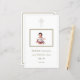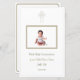 Celebre la Primera Comunión Sagrada de su hijo con este elegante menú de personalizable. El diseño presenta una cruz con acento dorado en la parte superior, simbolizando la fe, y una foto central enmarcada de tu pequeña, haciendo que la carta sea verdaderamente personal. El fondo blanco y el texto oro refinado le dan un aspecto limpio y sofisticado, mientras que la mezcla de guiones y tipos de letra serif le da un toque clásico. Perfecto para crear un recuerdo preciado de esta ocasión especial. B004