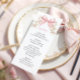 Sweet and elegant 'Baby in bloom' themed baby girl shower menu cards featuring cute blush pink coquette bow surrounded by spring summer flower bloom.