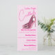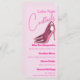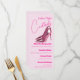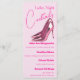 Este glamuroso menú personalizado presenta una temática de fiestas de cócteles nocturnos Damas. El título "Cócteles" se imprime en la parte superior en una fuente de escritura neón rosa. Bajo el título del evento se coloca un brillante par de estilettos rosas, seguidos de una variedad de bebidas de muestra.