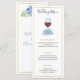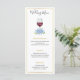 Un menú de boda de 4" x 9" con hortensias azules de acuarela y un vaso de vino tinto, elegantemente enmarcado en dorado. El menú incluye opciones para Aperitivos, Platos Fuertes y Postres, y el reverso es personalizable con los nombres de los novios.