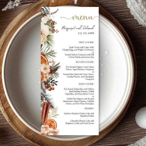 Añada un toque de elegancia a su fiesta boda con nuestro "Menú Boda de Navidades Florales de Citrus de Invierno". Completando perfectamente nuestra colección, este menú promete impresionar a sus huéspedes. Compra ahora y prepara el escenario para una experiencia culinaria memorable.