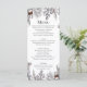 Los detalles del menú están dentro de un marco de acuarela botánica que incluye eucalipto, pino y hojas en plata, óxido y gris. El dorso de la tarjeta es gris pálido