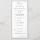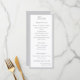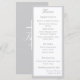 El diseño del anverso presenta un fondo blanco puro para su texto personalizable. El título se muestra en una fuente elegante en el centro superior. Siguiendo el formato tradicional para un menú de boda, todo el texto es personalizable y se muestra en una fuente Nupcial de color plateado elegante. Todo el diseño está enmarcado por un borde de color plateado y blanco.