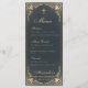 Este elegante menú con aire vintage, recomendado para la primera comunión de un niño, tiene a ambos lados un marco barroco dorado sobre un fondo azul oscuro. El nombre, el título "Menú" y los subtítulos están escritos en un guión caligráfico elegante. Todo el texto puede ser personalizado y tiene un color dorado similar al marco dorado. Hay una (falsa) cruz de oro encima del texto. El fondo con sus elegantes decoraciones doradas en azul oscuro proviene de un encuadernador de libros francés vintage, de Georges Mercier (1885-1939) - Madame de Maupin de Teophile Gautier, volumen 1, edición 1911, París - ahora de dominio público.