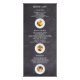 Tener esta tarjeta de menú de alimentos elevará la ambientación de la fiesta que está planeando, o puede ser utilizada como una herramienta para promocionar las especialidades culinarias de su restaurante. Su estética clásica de pizarra le da un ambiente acogedor y casero que hará que los invitados o clientes estén ansiosos por explorar sus deliciosas ofertas y dejar una buena impresión duradera. El diseño tiene un toque minimalista y sin embargo muestra una visual atractiva a través de sus elementos gráficos y textuales destacados, perfecto para mostrar y comercializar de manera profesional los especiales diarios o platos emblemáticos. También puede personalizar esto reemplazando las fotos que desea destacar para hacer que esta herramienta promocional o elemento esencial de la fiesta sea más cautivadora. Agregue un logotipo del restaurante en la parte posterior para ampliar ampliamente la identidad de su marca y hacer que su negocio sea más accesible al incluir detalles de contacto, correo electrónico, sitio web, ubicación y redes sociales.