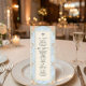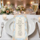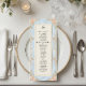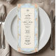 Traslade a sus invitados a una era romántica con este diseño inspirado en el Rococó que presenta flores y querubines pintados con acuarela. Perfecto para una recepción de cuento de hadas en un jardín. Este diseño presenta una composición lujuriosa y romántica centrada en un fondo azul claro que simula una textura de mármol impreso. Los bordes están adornados con un marco de filigrana dorada falsa ornamentada en estilo barroco, entrelazado con ilustraciones de acuarela de rosas melocotón, margaritas crema y helechos verdes salvia. En la parte superior, querubines caprichosos se representan tocando violines, flanqueando una ilustración clásica de una campana de servir. El texto está organizado en una jerarquía tradicional utilizando tipografía serif de carbón elegante y un encabezado de caligrafía manuscrita fluida para un acabado sofisticado. Esta es una imagen