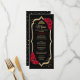 Tarjeta de menú Quinceanera roja de oro negro. Incluye tipografía de guiones, rosas rojas, tiara y confetti. Diseño elegante con oro falso purpurina. Perfecto para una elegante celebración de glam.