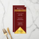 Carta de la recepción de bodas de color rojo oscuro con triángulo geométrico de bloques de color dorado y rayas. Tipografía elegante para una mirada cara a un precio asequible. Personalizar la lista de comidas y los detalles personales. Ideal para una temática moderna y minimalista de boda con un toque de estilo.