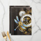 Diales antiguos con artes de oro y latón, decorados con libélula mecánica sobre fondo marrón, rayado. Steampunk.