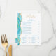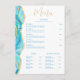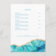 Otro menú de restaurante elegante de Blue Sands Studio. Este menú moderno presenta un diseño de acuarela azul aguamarina con detalles de brillo dorado falso. Reminiscente de la piedra de ágata. Las fuentes serif clásicas se combinan con caligrafía fluida. Plantilla fácilmente editable para insertar las secciones y elementos de su menú. Distribuido en Entrantes, Acompañamientos, Sopa y Ensalada, y Postre. Si necesita ayuda o consejo, por favor envíeme un mensaje de Zazzle.