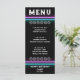 Menú de cena de cumpleaños retro Guay con rayas de neón rosa y azul y notas musicales. Ideal para los músicos o los amantes de la música disco nacidos en los años 80 o de una fiesta de cumpleaños de los 80. Diseño unisex para hombres para mujeres. Personalízalo añadiendo el nombre del niño de cumpleaños o del chica y el año de nacimiento.