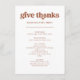 Estos elegantes menús de acción de gracias o de platos de la amistad presentan un texto retro de terracota que dice "dar gracias" con un fondo sencillo de color blanco.