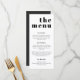 Este menú presenta una audaz fuente serif y un diseño minimalista moderno. Utilice esta plantilla para editar los tipos de letra, el color de la fuente y el color de fondo para que se correspondan con sus necesidades de eventos.Este menú hace la adición perfecta a su sencilla ducha de bebé, contemporánea, retro o bohemia, ducha de novia, boda, jubilación o cualquier otro evento. Este menú de tabla presenta una sencilla combinación de color blanco y negro, pero todos los colores son 100% editables para que coincidan con su estilo.