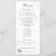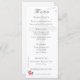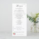 El diseño presenta la imagen débil de un crucifijo de color plateado contra el blanco puro como fondo del texto del personalizable. El formato sigue al de una tarjeta de menú boda tradicional. La imagen de una rosa rosa grava la esquina inferior izquierda. Los nombres de Novia y Groom junto con la fecha de boda se muestran al revés en la parte inferior. Diseñado para coordinar con la "Suite Nupcial Rosa Boda Católica". Todo el texto está en una fuente de color plateado.