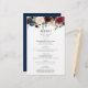 Mejora el ambiente de tu boda rústica en otoño con una carta de boda muy bien elaborada que capta la esencia de tu día especial. En la parte superior de este elegante menú, un ilustracion floral acuático revive con armonía una mezcla armoniosa de flores borgoñas, azul marino y rubí que refleja perfectamente los ricos tonos cálidos de la temporada. Justo debajo de esta impresionante obra de arte, los nombres de la pareja se muestran con elegancia, añadiendo un toque personal que marca el tono de las festividades de la noche. El menú está bien organizado, guiando a los clientes por cada plato con elegancia y estilo. Todos los detalles, desde la selección de fuentes hasta la disposición, están diseñados para complementar la obra de arte floral y crear una experiencia cohesiva y lujosa que combina perfectamente con la decoración boda. Coordinada con la colección rústica de Borgoña y Floral Azul de la Marina, esta carta boda es la opción ideal para bodas rústicas y otoñales. No sólo sirve como guía práctica para sus invitados, sino también como un bello recuerdo que valorarán mucho después de que la celebración haya terminado. Haga inolvidable su día de bodas eligiendo una carta de menú que refleje la elegancia y el encanto de su evento. Solicite ahora y deje que sus huéspedes disfruten de una experiencia gastronómica tan memorable como su historia de amor.
