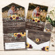 Complete your reception tables with this beautifully coordinated rustic wedding menu card featuring sunflowers and burgundy roses, designed to bring warmth and elegance to your dining experience. Set against a rich woodgrain background, this menu perfectly captures the charm of a countryside or barn wedding while maintaining a refined and polished look.