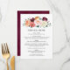 El diseño de la carta de la cena boda presenta una redacción elegante que puede ser completamente personalizada, acentuada por un diseño rústico de color de agua floral de verano y otoño con hermosos rosas, dahlias, flores de peonía y vegetación, en una espléndida paleta otoñal de rojo burdeos, amarillo dorado, naranja de melocotón, rosa rubor y tonos verdes. Un color de fondo rojo burdeos con una apariencia texturizada se viste por la parte posterior de la tarjeta.