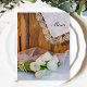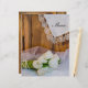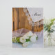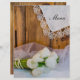 El encantador menú rústico de bodas rurales de los tulipanes blancos se puede personalizar con los detalles de la comida que se sirven en el almuerzo de la ducha nupcial de marzo, abril o mayo, la cena de la recepción matrimonial o el brunch posterior al boda. En la carta, informal pero distinguida, de estilo personalizado occidental, se presenta una pintoresca fotografía floral de un ramo de flores de tulipán blanco, collares de perlas blancas, velo nupcial y un pañuelo vintage de lino con fondo de madera marrón.