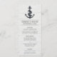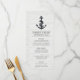Un ancla en forma de chalé sobre un fondo de madera blanquecina. Una cinta de la ancla dice "menú". Todo el texto se puede personalizar fácilmente. Perfecto para un boda de temática náutica, sobre todo si te gusta el estilo rústico o vintage.