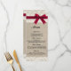 Este menú casero es la combinación perfecta entre lo tradicional y lo moderno. El fondo burlap es perfecto para un boda de temática rústica o vintage y el acento de encaje le da un toque clásico y romántico. Coordenadas con colección completa de invitaciones rojas coincidentes, Guardar las fechas, tarjetas RSVP, franqueo de personalizados y más! ¡Envíame un correo electrónico por colores personalizados! NOTA - Esta es una imagen de alta calidad de burlap, lace & ribbon; esta invitación no contiene burlap, lace ni ribbon reales. ¡Gracias!