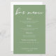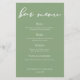 El sencillo menú del bar boda verde sabio incluye un elegante guión blanco para una ceremonia al aire libre en un entorno natural. Tipografía minimalista sobre una tranquila hoja verde claro para un local rústico afuera de un bosque de árboles.