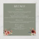 El Sage Green Elegant Floral Square Boda Menu es una obra maestra que combina a la perfección la sofisticación con la belleza natural, lo que lo convierte en la elección perfecta para las novias que buscan un toque de elegancia eterna para su boda en otoño. La carta, elaborada con esmero y esmero, sirve no sólo de guía práctica para los clientes, sino también de fiesta visual que completa la estética general del boda. El color predominante de la carta es un verde sabio rico y encantador, que recuerda a los tonos tierra del follaje otoñal. Esta elección no sólo aporta un toque de calidez, sino que también resonará en la belleza orgánica de la temporada. El formato cuadrado del menú presenta un toque contemporáneo, con un lienzo único y moderno para los exquisitos elementos de diseño. La carta está decorada con complejos motivos florales que evocan la esencia de un jardín floreciente. Delicados ilustraciones floridos de acuarela, en diferentes tonalidades de burdeos, rubor y oro, se reparten meticulosamente por la carta, creando una armonía de colores que refleja los cambiantes tonos de la caída. Los motivos florales están decorados con elegancia, lo que contribuye a una sensación general de gracia y refinamiento. La tipografía elegida para el menú es igualmente de buen gusto, con una mezcla de guiones y tipos de letra serif que exudan sofisticación. Los encabezados y los elementos del menú se presentan en un bonito borgoña, lo que contrasta con el verde sabio. Esta elección no sólo garantiza la legibilidad sino que también añade un toque de opulencia al diseño general. En conjunto, el Sage Green Elegant Floral Square Boda Menu es una delicia visual que refleja la esencia de una elegante boda de otoño con su rica paleta de colores, sus intrincados motivos florales y sus cuidados elementos temáticos. Este menú no sólo sirve a su propósito práctico, sino que también se convierte en un querido keepsake que refleja el compromiso de la novia de crear un día de boda intemporal y encantador.