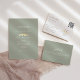 Elegant sage green wedding menu with a romantic faux gold lovebirds illustration and white minimalist typography. Perfect for spring, summer or fall receptions, this menu card complements a timeless and nature-inspired wedding theme. Fully editable with your starters, main course, and dessert. Matches the full gold lovebirds wedding suite.