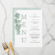 El verde eucalipto deja un diseño boda floral en su gran menú casero. El fondo es un verde suave con una textura de mármol. Un diseño de hoja personalizado con su información fácilmente cambiada para personalizar su boda estacionario. Boda personal estacionario de Just Fine Designs.