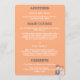 Este precioso menú boda incluye un ilustracion encantador de novia y novio. El novio está representado con el pelo castaño corto, un cutis claro, y lleva una chaqueta azul marino sobre una camisa azul claro y una corbata blanca. Él tiene un pequeño boutonniere fijado a su solapa. La novia está parada a su lado, sonriendo dulcemente. Tiene el pelo ondulado, de naranja rojizo, adornado con una flor corona de flores rosas, naranjas y flores blancas. Un delicado velo blanco corre detrás de ella. Ella lleva puesto un vestido blanco boda con un collar de enamorados y perlas. Este simple ilustracion de tipo personalizado sugiere una conexión amorosa de cuerdas entre ellos. Es caprichoso y entrañable, dando un tono alegre para el próximo boda. El menú de la parte posterior, en un fondo naranja, está separado en tres secciones con títulos de personalizable y contenido, puede modificar, eliminar o agregar más secciones si lo desea.