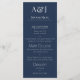 Este menú de boda elegante y moderno presenta un fondo azul marino. Dos iniciales de muestra están impresas en la parte superior en una fuente gris pálido. Puedes personalizar el menú para incluir tus propias iniciales y opciones de comida personalizadas. La parte inferior del menú presenta tres platos con dos opciones cada uno. Puedes reemplazar los platos del menú con las opciones de comida que elijas. La parte trasera del menú es de un color azul marino a juego. Es adecuado para eventos de desayuno, brunch, almuerzo o cena.