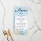 Este elegante y festivo menú propone un fondo blanco en el centro con un patrón de hielo helado azul en las partes superior e inferior. Tema invernal impreso en un diseño purpurina de imitación blanca de marfil. Cerca del fondo del menú hay pinos y varios copos de nieve dispersos por el fondo. El texto se imprime en una fuente elegante y sofisticada que puede personalizar para incluir sus propias opciones de restauración. La parte posterior del menú presenta un diseño similar a la helada con la misma imagen de invierno impresa sobre la parte superior.