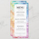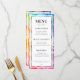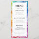 Presentamos la delgada carta del menú de la "Ethereal Bloom Collection", una impresionante y artística adición a la recepción de tu boda. En la parte superior de la tarjeta, con un cautivador telón de fondo de dibujos animados con tinta de alcohol en tonos azules, morados, rojos, naranjas y verdes, el título "Menú" aparece de forma elegante. Los nombres de la pareja y la fecha del boda se destacan de forma destacada, añadiendo un toque personalizado al diseño. Debajo de la cabecera, se presenta una cuidada selección de comidas, cuidando los detalles. Desde aperitivos hasta entrantes y postres, cada plato se describe para reflejar los gustos y preferencias de la pareja, invitando a los clientes a disfrutar de una experiencia culinaria cuidada. Pasando al reverso, la obra de arte etérea continúa, creando una presentación impecable y llamativa. En la parte superior, la leyenda "Bebidas" se exhibe con elegancia en un ambiente de colores vibrantes y vibrantes. Un mensaje de personalizable invita a los clientes a disfrutar de una cuidada selección de bebidas, ya sean cócteles de autor, excelentes vinos o refrescantes opciones sin alcohol. Debajo de este sincero mensaje, se reiteran los nombres de la pareja, añadiendo un toque cálido y personal. Esta delgada carta, elaborada con un toque artístico e inspirada en la encantadora belleza de la colección "Ethereal Bloom", le aporta un toque de sofisticación y encanto a su celebración boda, asegurando que los huéspedes saboreen cada momento de este día especial.