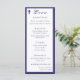 Design front features a white background to the image of a cross in top left corner. Heading is displayed in an elegant font in top center. Following the traditional format for a wedding menu, all text is customizable and displayed in a navy-blue font. Entire design is framed by a navy-blue and white border.