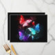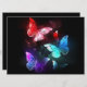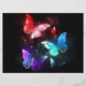Tres mariposas luminosas, rojas, violetas, verdes, texturadas, nocturnas sobre fondo luminoso negro.