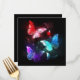 Tres mariposas luminosas, rojas, violetas, verdes, texturadas, nocturnas sobre fondo luminoso negro.