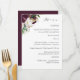 Un romántico floral, un ramo de audaces magnolias de terciopelo, flores de marfil y hojas de rosa doradas y verdes adornan el elegante menú tipográfico de la esquina. Añade los detalles de la cena o el brunch de su boda utilizando la plantilla. Perfecto para cualquier boda o celebración con temática de jardín o exterior, este elegante diseño está incorporado en toda una suite boda de artículos de papel para un tema bien coordinado. La parte posterior del menú está en un color de terciopelo coordinado