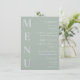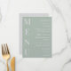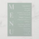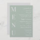 El elegante y sofisticado menú boda de la cena ofrece un suave fondo verde sabio con un texto de color gris claro. La palabra "MENU" se imprime en un diseño vertical a lo largo de la parte izquierda en un tipo de letra gris gigantesco, con los alimentos impresos a la derecha. Puede personalizar las opciones para incluir sus propias opciones de menú personalizado para su boda u otro evento especial.