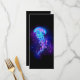 Gran medusa azul, de dibujo artístico, brillante y brillante, con largos tentáculos sobre fondo negro con bioluminiscencia violeta. Luminosas medusas.