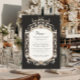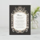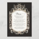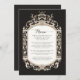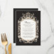 CHARCOAL JET BLACK & GOLD, MENÚ DE CENA FORMAL PARA LA RECEPCIÓN DE BODAS O DUCHA BRIDAL. Aspecto clásico y ostensiblemente ornamentado, dorado y dimensional, marco barroco victoriano rococó sobre un elegante patrón vintage de damasco tono en blanco y negro que fue diseñado gráficamente por la artista con licencia internacional Audrey Jeanne Roberts ©