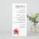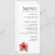 An elegant coral red and white hibiscus wedding menu featuring modern watercolor designs with tropical greenery and exotic florals for your Hawaii celebration.
