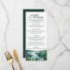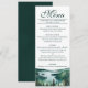 This wedding menu is simple, rustic, and elegant. It features a fancy script calligraphy title with a watercolor landscape of Lake Tahoe with mountains and pine trees. The back is a deep marbled forest green color. Perfect for an outdoor reception.