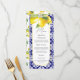 El menú de la recepción para la cena, de temática cítrica moderna, incluye flores de limón y azulejos azules mediterráneos. Se pueden cambiar todos los textos, tipos de letra y colores. Elementos de coordinación disponibles para completar el conjunto de bodas.
