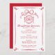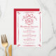 Complete your holiday table with this hand-drawn Christmas dinner menu featuring red illustrations and lettering on a white background. The design showcases a ribbon bow at the top, followed by a festive dinner plate and silverware illustration. “Christmas Dinner” is displayed in a handwritten red script with space below for your custom menu items and date. A flowing red ribbon frame borders the layout, creating an elegant and cohesive look that pairs perfectly with matching invitations from the same collection.