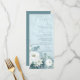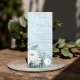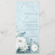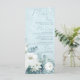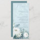 White Roses Hellebores Silver Eucalyptus floral wedding menu featuring elegant calligraphy script modern watercolor flowers frosty pale blue background and snowflake details