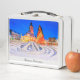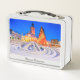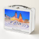 Bonita lonchera blanca para niños con mercado de Navidades en Brasov.