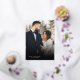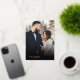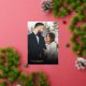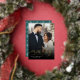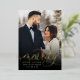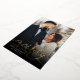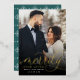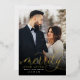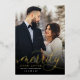Las elegantes tarjetas de fotos para recién casados incluyen una foto boda vertical o orientada a retratos preferida con "Merrily Ever After", superpuesta en un guión de caligrafía de Relieve metalizado oro de lujo. Personalice con sus nombres o saludos personalizados debajo. Un diseño sutil y moderno de copos de nieve en el lado inverso completa el aspecto. Perfecto para compartir una foto boda para sus primeros Navidades casados.