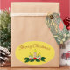 Pegatina oval de fondo amarillo con velas ardiendo en una cama de holly y "Feliz Navidad" escrito en rojo encima de ellos.