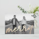 Celebra la temporada de fiestas con elegantes tarjetas de fotos de vacaciones. Las tarjetas vacacionales modernas incluyen "Merry" en un falso guión de Relieve metalizado dorado, marcadores de posición para tu foto personalizado y texto, y un diseño punteado en blanco y negro en la parte posterior.