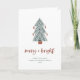 Esta simple tarjeta presenta un árbol de Navidad verde, estilo boho, con un guión informal de terracota que dice "alegre + brillante" en un fondo blanco.