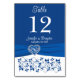 Esta romántica tarjeta boda floral de doble cara, azul real y blanco, tiene una imagen de un corazón real azul y plateado sobre una imagen de cinta azul real que cruza el fondo de la tarjeta con flores azules sobre un fondo blanco en el fondo. Hay un área de texto azul real encima de la cinta y tiene el número de la tabla, los nombres de la novia y el novio, y la fecha del boda en blanco. **DEBE CAMBIAR EL NÚMERO DE LA TARJETA POR CADA NÚMERO QUE NECESITE, AGREGARLO A SU CARRO, Y LUEGO REGRESAR Y REPETIR EL PROCESO POR CADA NÚMERO QUE NECESITE. Si necesita algún elemento adicional coincidente, envíe su solicitud a niteowlstudio@gmail.com o utilice la función de chat Zazzle para ponerse en contacto.